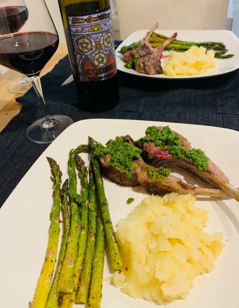 I decided to pair this wine with roast rack of lamb topped with pesto, grilled asparagus, and baked potatoes. It was magic! The rich red blend complimented the fattiness of the meat and savoriness of the sauce. It truly danced in my mouth. I also tried some of the 100% Alicante Bouschet with the lamb. If you are going for a little lighter, less opulant accompaniament to the food this is what I’d go for. The Source and Sink stepped back to let the lamb shine. Personally, I preferred the pairing of lamb with the richer red blend, and sipping the Alicante solo so I could really savor its qualities, But either style pairing works!