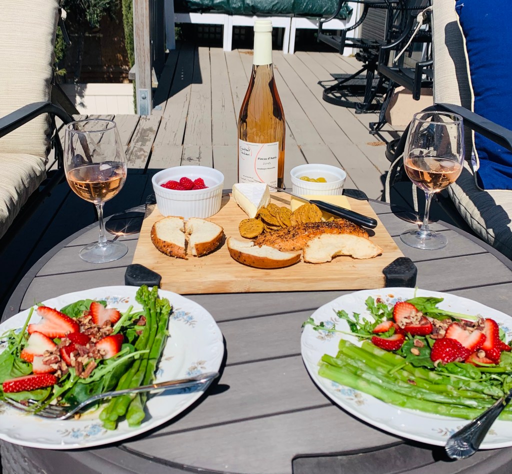 It screamed for salad. Slightly bitter arugula mixed with asparagus, topped with strawberries and walnuts did the trick. It paired perfectly with the strawberry fruitiness in the wine as well as its peppery, mineral qualities. The wine was still singing, though, so I wanted to play some more. In came smoked salmon and brie cheese. Yes! The wine intergrated into the richness of these foods and helped balance the creaminess and complexity. And after the meal, the wine paired perfectly with the sun!