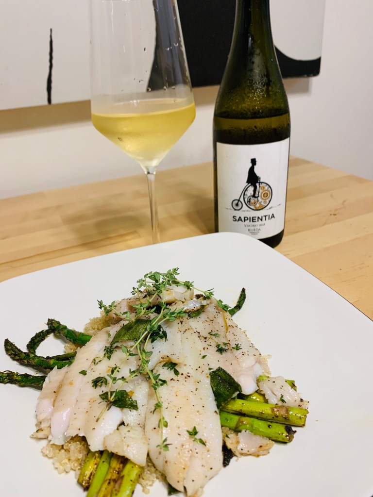 My pick was Dover sole pan seared with thyme and sage. The light, buttery fish would go perfectly with the white wine and the herbs would pull all the flavors together. I threw in some grilled aspargus and quinoa for texture. The result? Light, summery goodness. Which is perfect after all the heavy food I eat around the holidays!