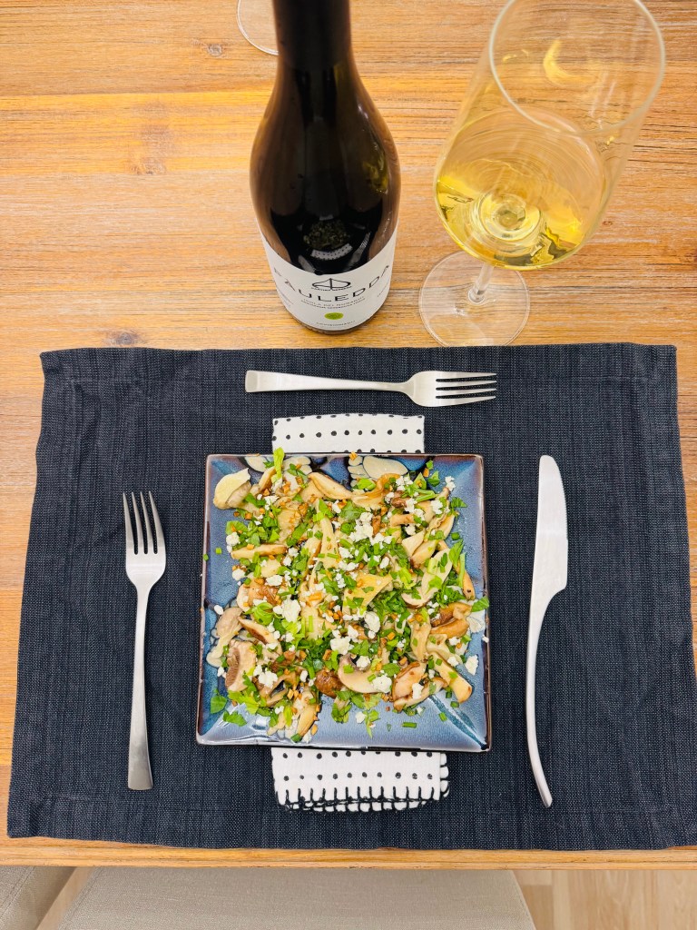 For the carpaccio, I layered thinly sliced mushrooms with olive oil, lemon, fresh oregano and celery leaves, added toasted garlic for crunch, and crumbled blue cheese over the top for a touch of creamy funk. The wineโs herbal character played beautifully against the earthiness of the mushrooms, while its gentle salinity balanced the richness of the cheese.