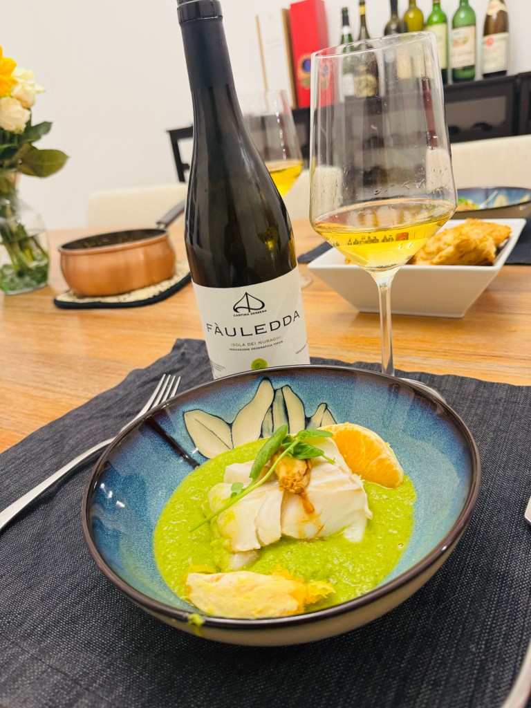 Since I couldnโt yet bring home a bottle of Montaresuโs wines, I opted instead for Cantina Dessenaโs Fauledda, a bright, textured white that called for a thoughtful pairing. I created two dishes to mirror its fresh, herbal lift: a delicate mushroom carpaccio to start, followed by cod with watercress and orange sauce.