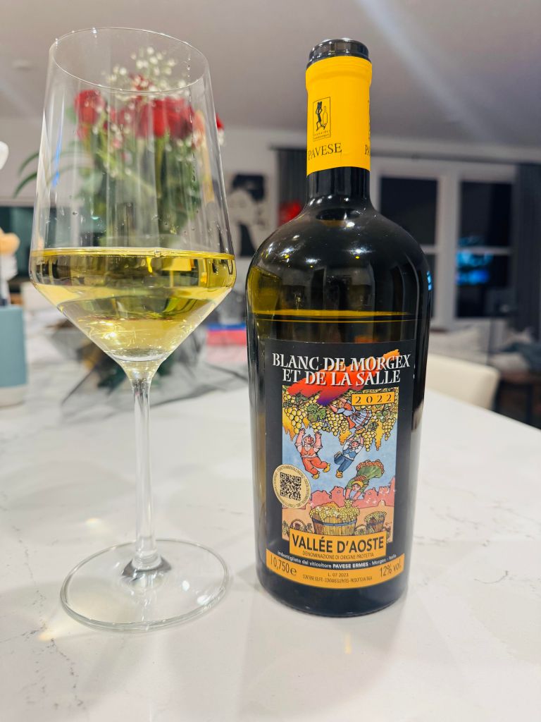 The second bottle was a 2022 Ermes Pavese Blanc de Morgex et de la Salle Prié Blanc. Winemaker Ermes Pavese works with his son, Nathan, and daughter, Ninive, on 18 1/2 acres of land dedicated to the grape. His vineyards climb upwards with the help of terraces and stone walls and the pergola system allows the leaves to form a sort of protective umbrella over the grapes shielding them from high winds.